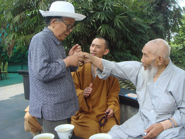 老和尚现在每天都要坐在峨眉山报国寺之佛像开光处,一面念佛,一面为有缘众生赠送念珠,并一一婆心劝诫:念佛、念佛,为众生种下成佛的往因,并深切地强调“念佛就能够成佛”!据统计,多年来他老人家赠送的念珠已达十万之数。