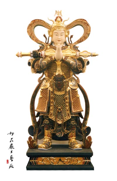 梵文:Veda。又名违驮天,本是婆罗门的天神,南方增长天王的八大神将之一。在中国寺院通常将之安置在天王大殿弥勒菩萨之后,面对着释迦牟尼佛像。传说佛涅盘时,有一捷疾鬼盗qu佛牙一双,时韦驮天急追取还,故为护打法神将,世称韦驮菩萨,形像一般是童子面,身披甲胄,手持金刚杵。是『二十诸天』中第十二天。