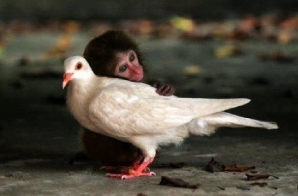 一只与妈妈走失的小猴子,对这个世界既充满了恐惧,又满怀着希望,它深情地拥着白鸽,体验着这个世界;白鸽没有害怕和抗拒,它用接纳回应着这只孤独的小猴子。爱无疆,谁说过爱只存在于人类?