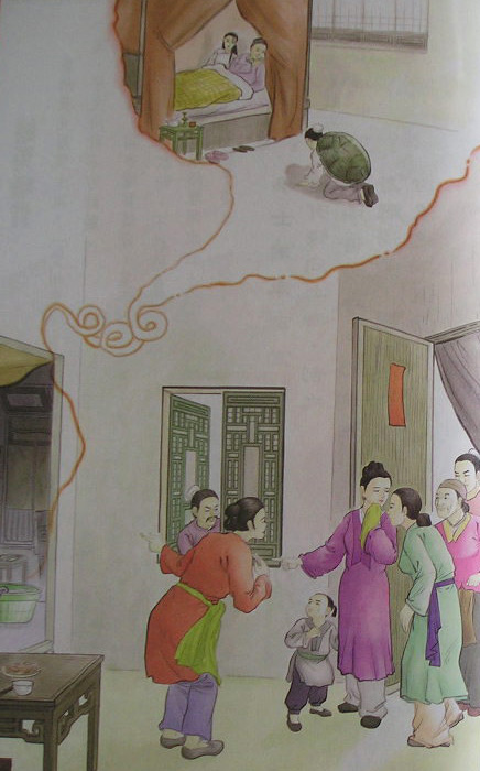 次日早上,渔夫送来一只大鳖,其妻劝他说:“昨夜梦见的黑衣人,恐怕就是这只大鳖,我们何不放生,做一件善事?”某见鳖心迷,没有允许,将鳖宰割烹煮,尽情啖食。