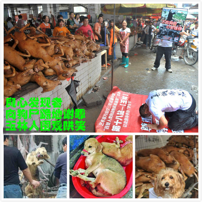 2013年夏至,不顾网友异口同声的反对,不管微博中诸多明星的声讨,广西玉林狗肉节如期举行,餐馆门外停满外地豪车。据新华社的报道称,每年这一天,该市要吃掉上万条狗,“实际被吃掉的狗还不止这个数。”杀狗场面血腥无比:狗被关在笼子里,任食客点杀,然后用头部闷棍等残忍方式致死。在类似《舌尖上的中国》等提倡大吃特吃的美食节目的迎风造势下,今年的狗肉节,又将有多少人类最忠诚的朋友葬身刀口?!