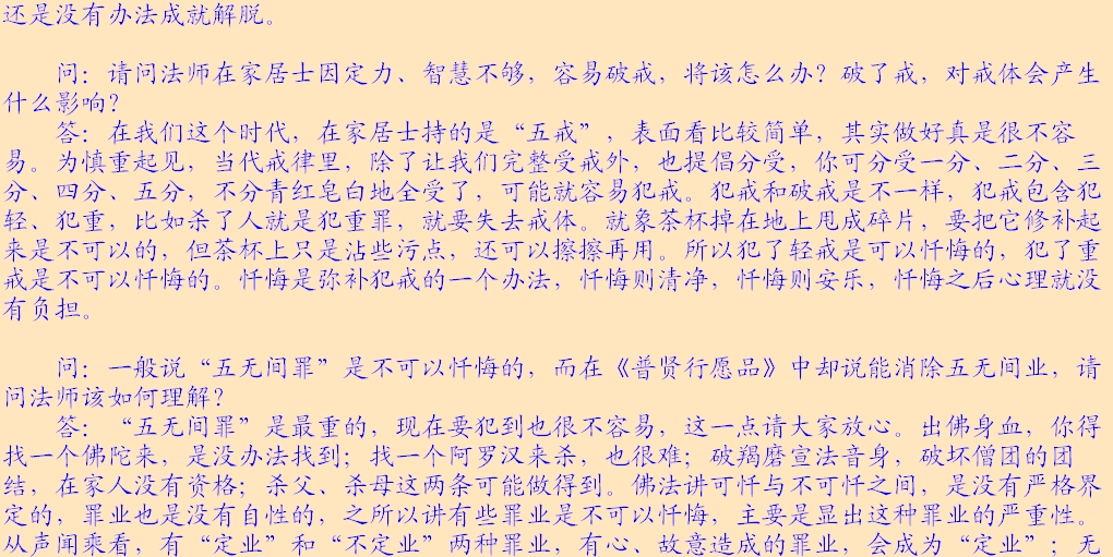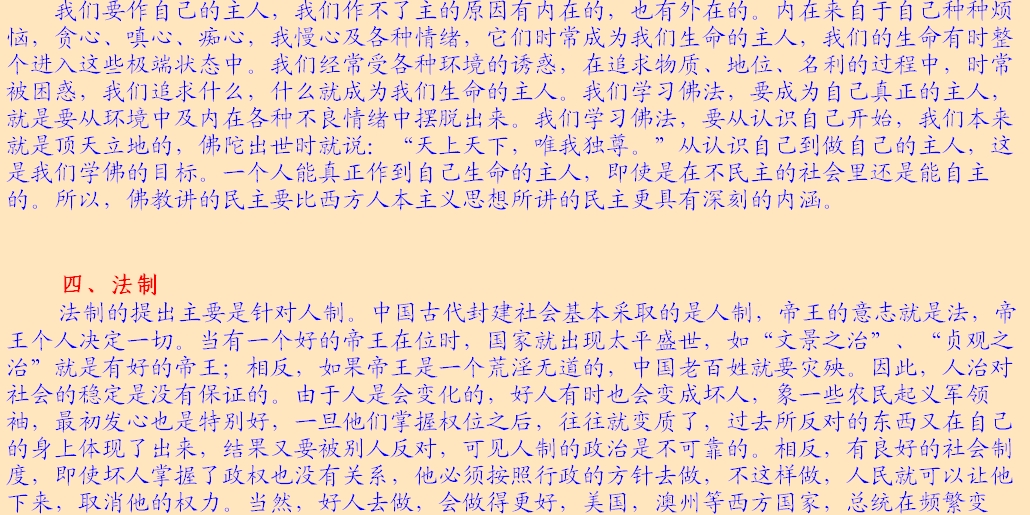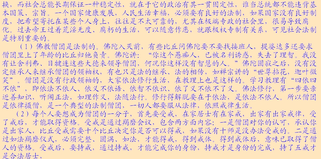 (2)法律面前人人平等。所讲的法律主要指的是戒律,佛以戒为师。《遗教经》讲:戒律就是你们的老师,戒律就是你们的准则,戒律就是你们生活的规范,大家都要以戒作为自己的老师。每位出家人都要受戒,在家居士学佛后,首先受“三皈”,三皈包含着戒的内含。皈依佛,不皈依邪魔外道,这就有戒在里面;皈依法,不皈依外道典籍,也包含着戒;皈依僧,不皈依外道邪众,这又是条戒。在家居士最基本的准则是戒律,就是五戒。佛教徒合格的标准,是以戒律来衡量,如法持戒,才是合格的在家佛教徒。同样,出家也有不同级别的戒律,刚入僧团要受沙弥戒,接着受比丘戒,没有那个僧人是可以不受戒的。看你是否是僧宝,就要看你受戒的级别,戒律是取得某一资格的必然手续。受了菩萨戒,就取得了菩萨的资格;受了比丘戒,就取得了比丘的资格;受了在家戒,就取得了在家居士的资格。
