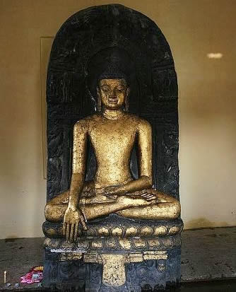 所以佛为了要惊醒大家,佛陀在那个时候入涅槃,这个就是佛陀宣布入涅槃的地方,边上我们看到的大水池就是阿育王修的一个大水池,阿育王在早期黑阿育王的时候领兵打仗,那时征杀四方,当时印度的土地面积非常的大。孔雀王朝时期他是统治全印度的,那时候是印度历史上国土面积最大的,但是到皈依三宝之后他就做民生事业。修水池啊,造塔啊,造佛像啊,造佛舍利塔,造寺院,大力护持佛法,就是把佛法的修行,高尚的文化在这个国度——印度国内推行。