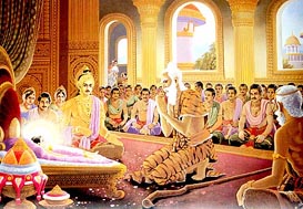佛陀在阿难陀铺好的僧伽梨(大衣)上,右胁卧下时,已经疲倦不堪。当时一位外道名叫须跋陀罗(SUBHADRA)的来求见时,佛陀又抖擞精神向他说法,成為最后度化的弟子。随侍佛陀的阿难陀等见佛病势沉重,十分难过,佛对阿难陀等说:「别难过,信任自己,紧握真理明灯,在真理中求解脱。」阿难陀三次请佛住世,佛陀回答:「万法自性仍归於灭,人人有生必有死,我的肉体怎能永存呢?我这段生命,必须循著自然法性而归於寂灭。」阿难陀和阿那律、罗罗等听了,不禁流泪!於是眾弟子公推阿难陀请问佛陀四个问题: