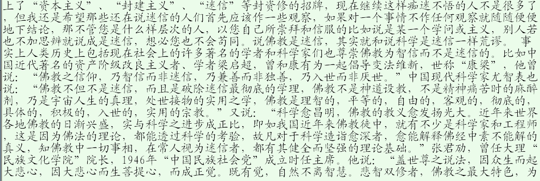 在我所遇到的各种学说中,包括数学、物理等自然科学以及其余的宗教,没有一个能最终解决我的疑惑,而且愈研究愈觉得徒劳无益。在遇到了佛教后,我才找到了慈悲与智慧的究竟正道,在解除人类痛苦和博大精深方面,超过了其他任何一门学说,而且愈研究愈有兴趣。瑞士的德维兹教授也有同样的体验:“不管我是否是佛教徒,我已经观察了世界上所有伟大的宗教体系,我最后得知从意境美妙和博大精神来看,没有那一种宗教能超过佛教的四圣谛八正道,因此我愿意按八正道去安排我的生活。” 世界上各种宗教林立,大多数都有导人向善、净化社会的良好功能,因此信教的人与不信教的人在性情、人格上普遍存在着一定的差异。1993年法王如意宝晋美彭措上师在加拿大与一百多位博士的座谈会上说:“没有学过宗教的人,难以确立一种正确的行为标准,学过宗教的人行为、处事则会更趋于合理。而在所有宗教中,最为殊胜的即为佛教。”关于佛教殊胜的观点,并非只是佛弟子的一种偏执之词,人们可以通过对流行于世的浩瀚佛教经论所诠释的丰富涵义与其余宗教涵义之间作冷静、客观的比较,即可得出上述结论。比如在理论上,佛法包含了所有宗教导人向善的特点,也具体分析了多数宗教中最高精神象征“万能神”的真实涵义与在理论上的层次;在实践中,其他宗教通过修持实践所能达到的种种果位(即最高境界和成就)在佛教中都可找到对应的位置,而佛教中那些比较超胜的果位(如阿罗汉、菩萨、佛陀)却已远远超出了其他宗教的范畴。因此从教义上,佛教的殊胜已非其余宗教之所能及。如参与了“百日维新”的思想家谭嗣同曾说:“佛教大矣,孔次大,耶为小。”即佛教最为博大精深,而儒家与ji 督教则相对较逊色。又说:“私谓释迦玄言,出过晚周诸子不可计数,程朱以下尤不足论。”马克思、恩格斯也都认为佛教中的辩证法已经达到了相当的高度,如马克思曾说:“辩证法在佛教中已达到很精细的程度。”米尔曼主教也说:“我越来越觉得释迦牟尼就是道路、真理和生活。”一位穆斯林学者评价道:“佛不仅是佛教徒的财富,他也是人类共有的财富。他的教法,对于每一个人来说,都是通用的。” yi si  lan教主张“信我者生,不信者死”,ji 督教也主张“信者得救”,而佛教则主张绝对的理智,并完全放弃强迫与暴力,中国现代著名美学家朱光潜说:“佛教以出世的精神,干入世的事业。”即佛教虽然超胜世间任何一门学问和宗教,但佛陀已证悟到,一切因缘而生的事物皆无有自性,都以如梦如幻如水月般的显现而存在,本来即是清净,基于如是对宇宙终极真理的证悟,故佛教能真正平等地看待宇宙中发生的所有现象而摆脱一切执著,并能以彻底无我的出世精神,来做慈悲地救度每一个受苦众生的入世事业,故佛教赢得了希求脱离痛苦和追求真理的每一个有情众生的心,不管他是属于何种宗派和持任何见解的人,所以只有佛教才是整个宇宙的宗教,是整个人类的宗教,是过去、现在、未来整个有情世界的宗教,她在无生无灭的法界中永时长存!如斯里兰卡前总理班达拉奈克说:“只要日月继续存在,只要人类还继续生活在这个星球上,佛法就会一直延续,因为佛教是人的宗教,是整个人类的宗教。”现代西方科学之父爱因斯坦评论说:“未来的宗教将是宇宙的宗教。它应当超越个人化的神,避免教条和神学,涵盖自然和精神两方面。它的根基,应建立在某种宗教意识之上,这种宗教意识的来源,是在把所有自然的和精神的事物作为一个有意义的整体来经历时得到的体验。佛教正是以上所描述的那种宗教。”在哲学界,本世纪最伟大的哲学家之一,著有社会及自然科学方面论著四十多部,并在1950年曾荣获诺贝尔文学奖的英国哲学家罗素,在考察了各种宗教后说:“世界上所有宗教中,我所赞成的是佛教。”
