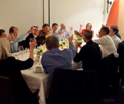 2011年2月17日,乔布斯以及硅谷十几位巨头与美国总统共进晚餐。坐在奥巴马左侧、被对着镜头的就是奥巴马。