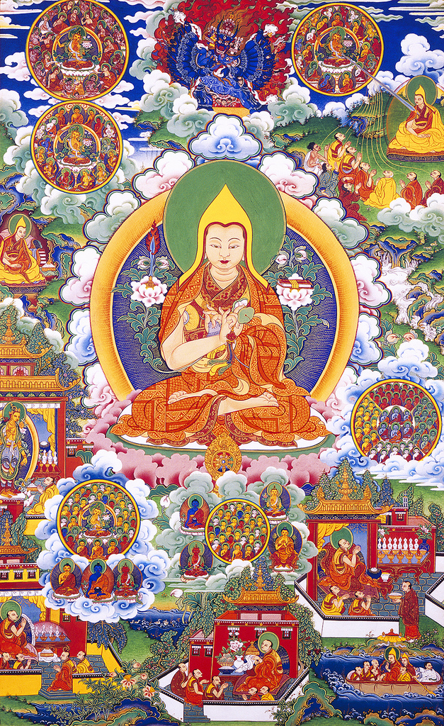 宗喀巴三岁时,正值法王迦玛巴游戏金刚,授给他近事戒,赐号庆喜藏。这一年,附近有位名la ma敦珠仁钦,施舍给他父亲好多马羊等财物,请求把这小孩送给他,得到应允。从此直至入藏以前,他依止敦珠仁钦,学了很多经论,并且受了密教的灌顶,他的密号叫不空金刚。七岁时,依敦珠仁钦受沙弥戒。 宗喀巴为了进一步深造,十六岁时(1372)他辞别敦珠仁钦前往西藏。十七岁到达拉萨东面的止公山林,在止公寺向阿仁波切座前听受大乘发心仪轨、大印五法、拿热六法等教法。以后又到拉萨西面的极乐寺,从吉祥狮子和善满听闻经论。又奉功德海和乌锦巴为正副阿阇黎学习《现观庄严论》。又依曼殊宝听受《大乘庄严论》等及弥勒菩萨所造诸论。这样几年之内学习了好多显密经论。十九岁在那塘时,学习《现观庄严论》;由于论中多引《俱舍》原文,比较难懂,因此又发心学《俱舍》。在那里他又从义贤译师听受意乐贤的《俱舍释》。第二年夏天他又到泽钦请庆喜祥讲《现观庄严论》。庆喜祥又介绍他到仁达巴那里听闻《俱舍》和《入中论》。仁达巴的学问修持都极好,因此成为宗喀巴一生中最重要的师长。那年秋季,又从大译师菩提顶受学《集论》。冬天从慧明律师听受《毗奈耶根本经》及其《释论》。二十二岁时仁达巴为他讲《集论》、《入中论》。那年秋后闭关专修,兼阅经论, 宗喀巴铜像对于法称的理论,生起了无限的信心。二十四岁那年的春天,他到那塘,听受高僧义贤讲授所著《释量论》的注释。夏季,他在那塘立《释量》、《集论》、《俱舍》、戒律四部之宗,同时受学许多密法。秋间在蔼寺从空贤学诗词,同时从那塘住持庆喜幢受得中观宗重要经论的传承。当时西藏中观宗诸论传承的人很少,由于宗喀巴得到传承,加以宣扬,后来受到中观宗诸论传承的人就很多了。以上仅仅是把他所学的经论略举几个例子,实际所学决不限于这些。大概藏中所有经论,他没有不听到讲授或受到传承或接触过的。