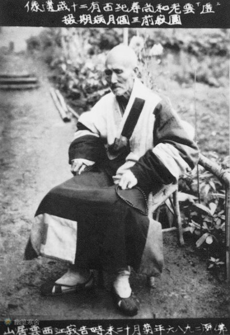 还没有圆寂的时候,他写了一张遗嘱,他死的时候,确确实实一百二十岁,这我知道。死了,就在他那个茅棚很近的地方挖了一个坑,弄些山上的柴火,把他那个龛子放到上面,就把他烧了!烧的时候,那时候正是斗争啊,五九年哪,虚云老和尚也受了摧残,他也是右派。后来老和尚另外又写了一个遗嘱,他说,这个和尚衣服可不要改呀,改了这个衣服,我们僧相没有了,佛教就不存在了,佛教的存在,就靠这个和尚衣服啊,靠这个庙啊!没有这个庙,没有僧人衣服就不行了!虚老和尚圆寂的时候说,以后出家剃头啊,要照他说的四句,跟以前不一样,说:金刀剃除娘生发,脱去尘劳不净身,圆领方袍僧相现,法王座下又添孙。这是虚老和尚说的,后来云居山收徒弟,剃头的时候都要说这个。