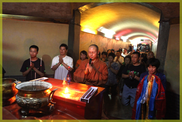 师父一行前往宝相寺地宫,虔诚礼拜佛牙舍利,并引领弟子们讽诵殊胜经咒,供养佛陀,此时香炉内的三支香发生着神奇的变化,形成了两边高中间低的——大莲花香,此香出现,预示佛祖临坛,在场弟子双手合十,默默感受着佛陀的加持,任凭泪水流淌