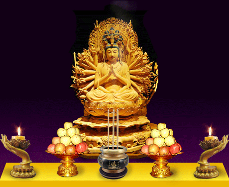 13、右掌撑起合于左掌当胸。此为一拜。至少三拜,多则以三数递加。拜毕尚有一礼,名曰问讯,当拜毕两手当胸时,鞠躬,将右掌置于左掌之内,叠成拳式后,将双手食指竖起相合,缓缓从下向上举起与眉间齐,再边徐徐下移至腹前,边右手置于左手之上,(手心向上),两大拇指相注,手便散开而退。此为拜佛礼毕,头再略一低而已。
