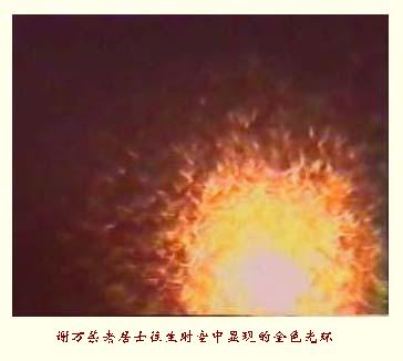 还有谢万荣老居士,她往生时空中现的是五色光,五色光来接引。也是刷刷转的莲花、爆开的莲花来接引,非常非常好,把四周助念的同修全都遮住了,这个同修请看录像。