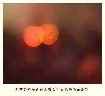 还有一位就是北京石景山的王万荣,这个录像是王万荣最小的儿子给录的,他不信佛。他说佛门净搞神乎其神,如果让我亲眼看见点什么,我就相信。王万荣有六、七个子女,除了她三女儿以外,没有人一个信佛。结果老居士往生的时候不但身体柔软、满院飘香,而且到处呈现金光,空中还出现了两朵莲叶。这是王万荣不信佛的儿子,亲自录像时捕捉到的。捕捉到以后,他才真正地“我皈入佛门吧”……不但她的小儿子皈入了佛门,她们家十几口人,连她的孙子,看到这个殊胜的场面以后,全都皈入了佛门,把他们全都度了。同修可以看到在空中悬挂着的两朵荷叶,非常清楚。这些都有录像。