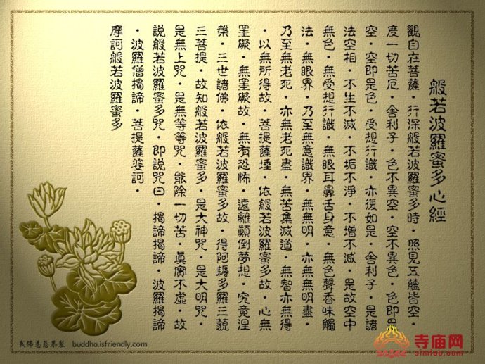 观自在菩萨.行深般若波罗蜜多时.照见五蕴皆空.度一切苦厄.舍利子.色不异空.空不异色.色即是空.空即是色.受想行识.亦复如是.舍利子.是诸法空相.不生不灭.不垢不净.不增不减.是故空中无色.无受想行识.无眼耳鼻舌身意.无色声香味触法.无眼界.乃至无意识界.无无明.亦无无明尽.乃至无老死.亦无老死尽.无苦集灭道.无智亦无得.以无所得故.菩提萨埵.依般若波罗蜜多故.心无挂碍.无挂碍故.无有恐怖.远离颠倒梦想.究竟涅槃.三世诸佛.依般若波罗蜜多故.得阿耨多罗三藐三菩提. 故知般若波罗蜜多.是大神咒.是大明咒.是无上咒.是无等等咒.能除一切苦.真实不虚.故说般若波罗蜜多咒.即说咒曰.揭谛揭谛.波罗揭谛.波罗僧揭谛.菩提萨婆诃.