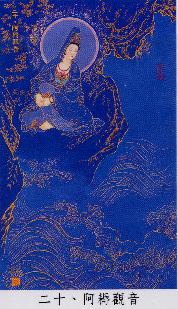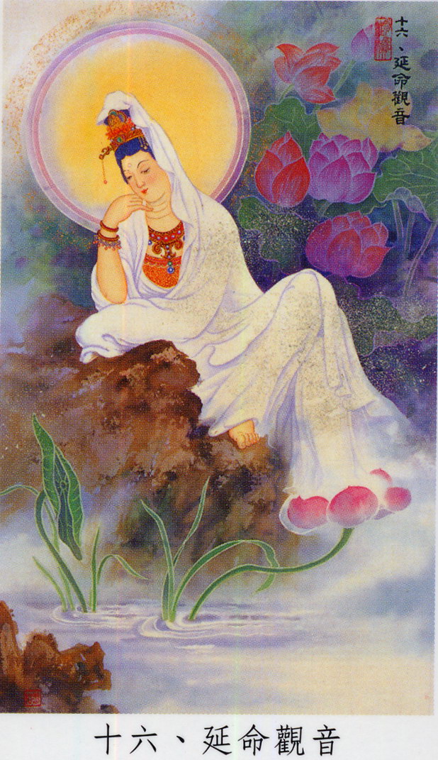 十六、延命观音(比丘尼身):倚水上之岩,右手支颐,头戴宝冠设阿弥陀佛之圣像。或释为表普门品中"咒诅诸毒药,所欲害身者,念彼观音力,还着于本人"。