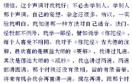 听经、学教,要听言外之音。读经,要看字理行间之外的义趣,就会恍然大悟;只要有一丝毫分别执著,就见不到!所以,我常常劝同学们要学,六根接触六尘境界学什么?不起心、不动念,这是最高的。最高的做不到的时候求其次——不分别。也做不到,再求其次——不执著。能不执著,就出三界,证阿罗汉果;能不分别,就证四圣法界果;能不起心动念,就是一真法界法身大士。佛给我们讲的这个原理、原则,是佛知佛见。一定要懂,要诚信,不能有一丝毫疑惑。