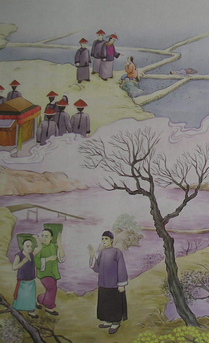 浙江绍兴县郡丞张公佐治,提升为浙江金华县太守。当张公离开绍兴,赴金华就任途中,经过一偏僻地处,见无数蝌蚪,在道路两旁,昂头鸣叫,有如呼冤,张公疑怪,下车步行察视,众蝌蚪跳踯在前引导,来到田间,发现下面一尸,尚能微动,张公即刻命人用汤灌救,顷刻间,苏醒复活说道:“我是商人,路见二人,肩挑两担蝌蚪,要往市场贩卖,我一时心生怜悯,便买来放生。二人却说:‘此处都是浅水,虽然放生,必再被人捕获,前有放生池,我俩带你前去。’当时我不疑有了,便跟随来此地。不料那两人,从我后面用斧背挥击,竟被击昏,不省人事,我那二仆,随行在后很远,身上携带资财,必是被那两个人引诱来此杀害,夺走资财。”