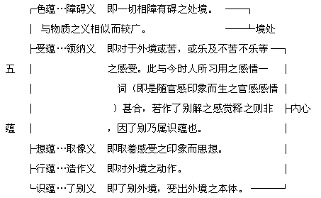五蕴,即旧译之五阴也。世间万法无尽。欲研高深哲理及正当人生观。应先于万法有整个之认识,有统一之概念。佛法既含有高深之哲理及正当人生观,应知亦尔。