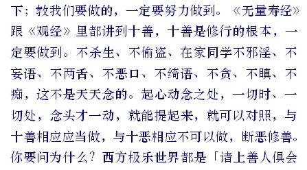 佛为什么这样强调彻底放下,因为「凡所有相,皆是虚妄」,把虚妄的放在心上,心就变成妄心,就这么个道理。极乐世界是真实的世界,是一真法界,带一丝毫虚妄去不了,跟极乐世界格格不入;要把一切虚妄都放下,才能够进入极乐世界,那个地方是一真、是清净。所以我们勉励同学们,起心动念想一想,要与真诚、清净、平等、正觉、慈悲相应,言语造作要与五戒十善相应,不可以违背。违背不但不能往生,肯定堕三恶道。为什么?破坏佛教形象,破坏佛教形象是什么罪?等于破和合僧的罪,五逆罪。别人认为释迦牟尼佛的弟子就是这样的,把释迦牟尼佛的人丢尽了,这罪多重。