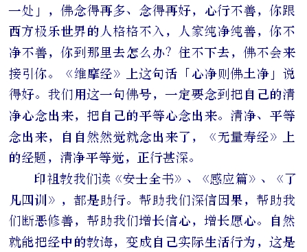 这些都是我们日常生活中养成的习气、毛病,要痛改前非。真正有效的方法,印光大师说得好,读经那来不及了,读因果!读因果,中国人无过于《感应篇》、《阴骘文》,每天去读这些,以此当作一面镜子、一个标准,检讨自己一天的思想、言语、行为。果然能依这个标准改过自新,你还有救;不依这个标准改过自新,没救了,这说实话。每天诵经念佛是福报,不能往生。不能往生就是你的习气太重,心不清净,三业不清净不能往生;往生的人三业清净,往生的人一点火气都没有了,火旺不行。